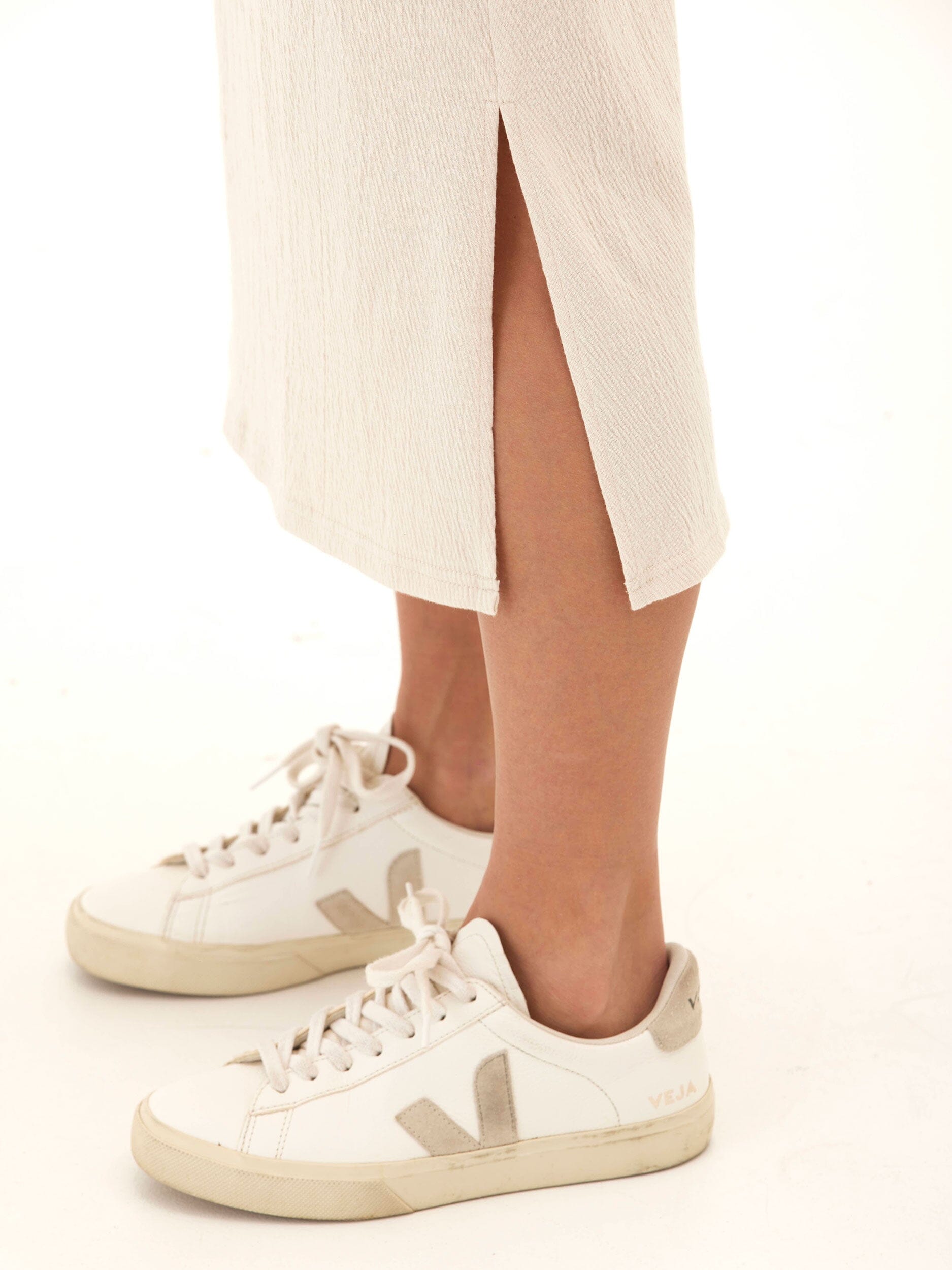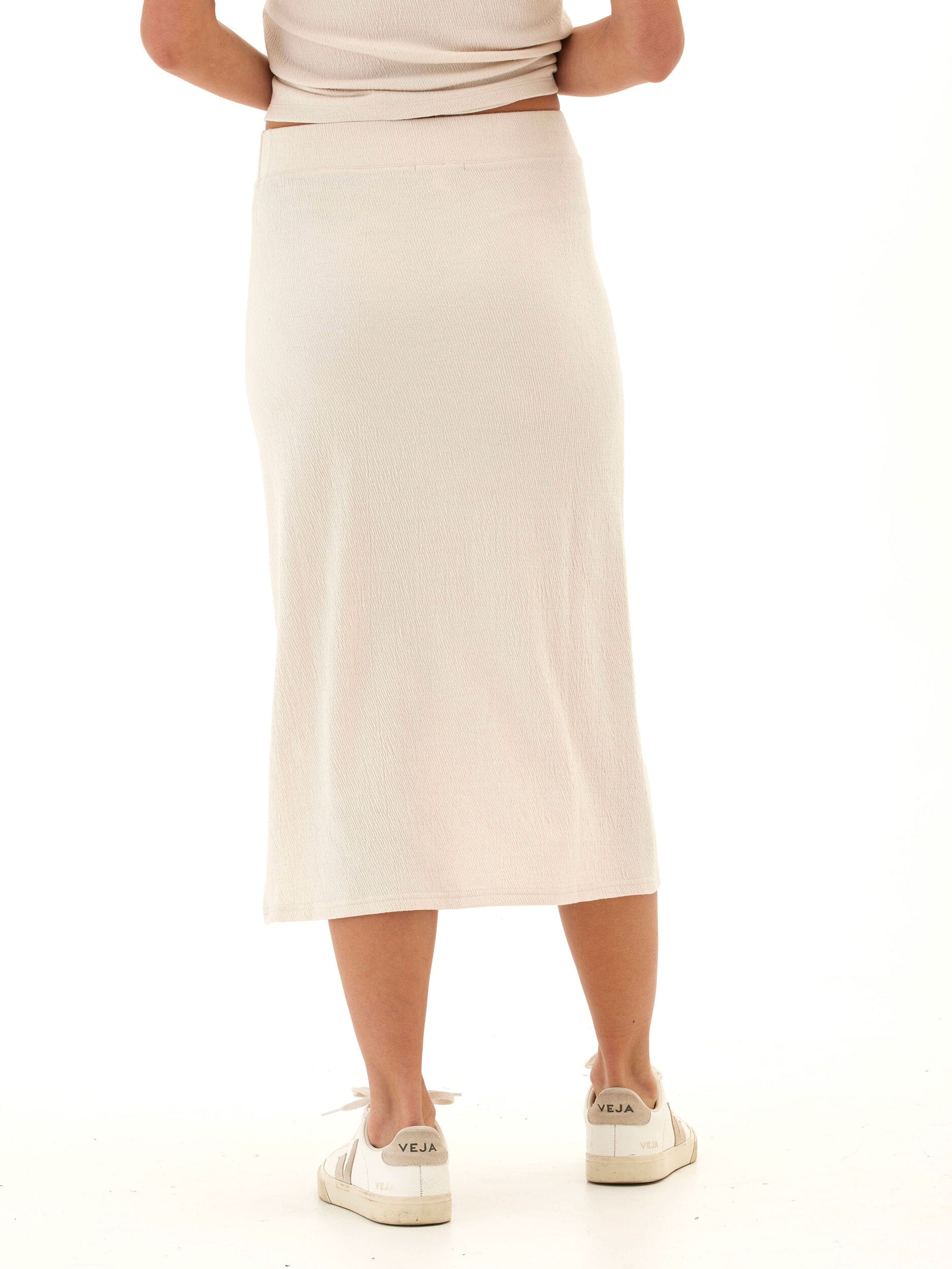 This midi skirt is made from soft, textured fabric with a comfy elastic waistband and side slit for added movement. Its streamlined silhouette makes it an easy-to-style staple for both casual days and elevated looks.