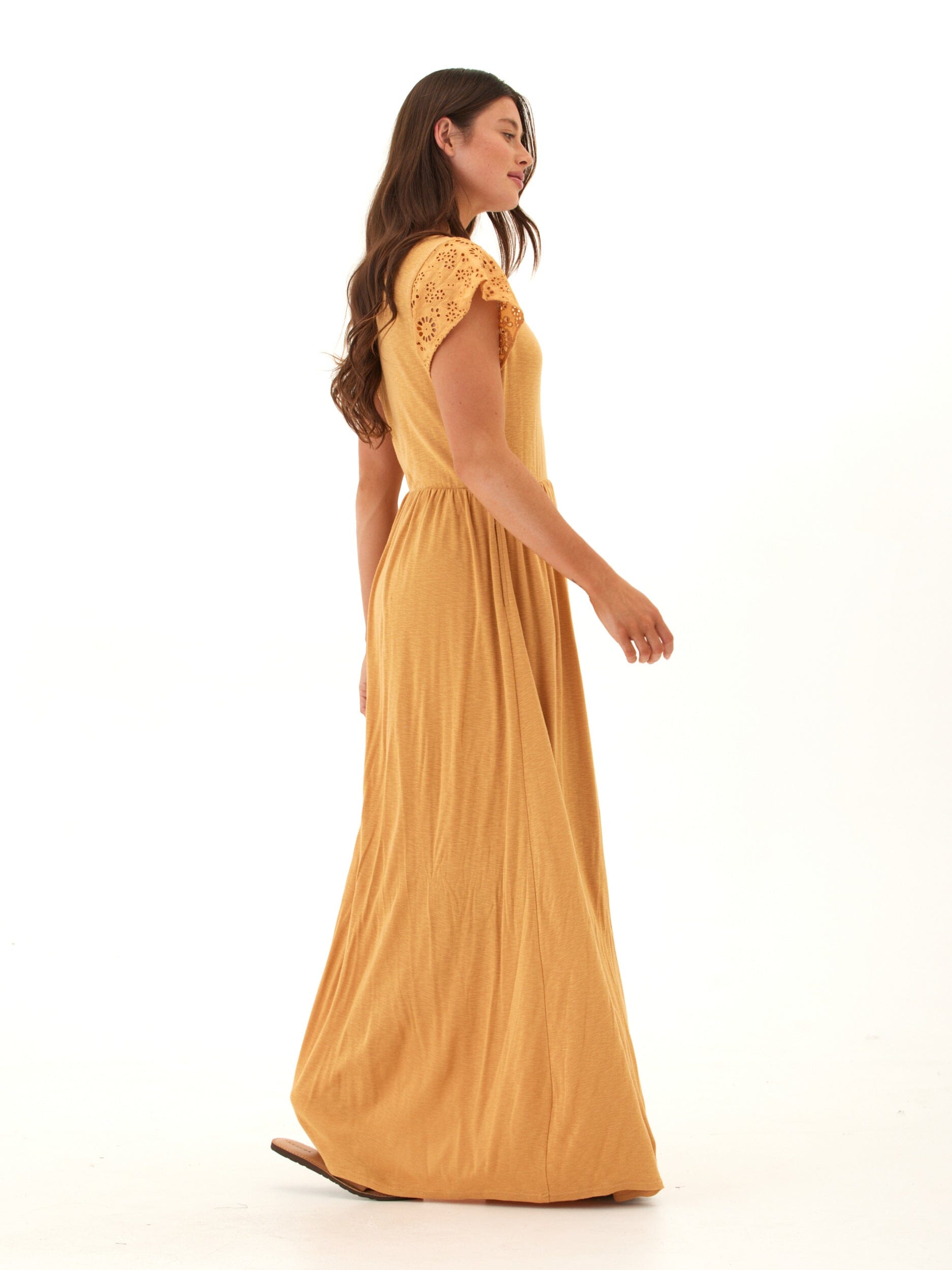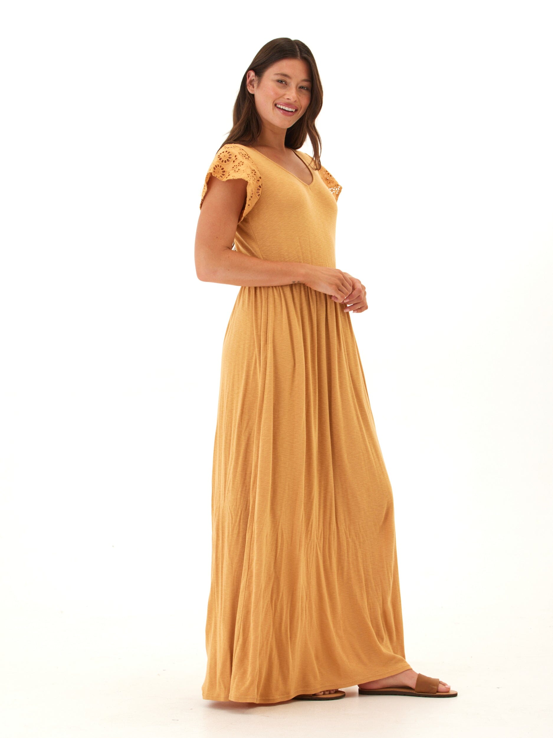 Feminine, flowy, and effortlessly flattering. The Alondra Dress is crafted from our lightweight textured slub jersey and features delicate eyelet flutter sleeves, a soft v-neckline, and a gathered waist. Side pockets add function to the romantic silhouette—perfect for sunny days and special moments alike.