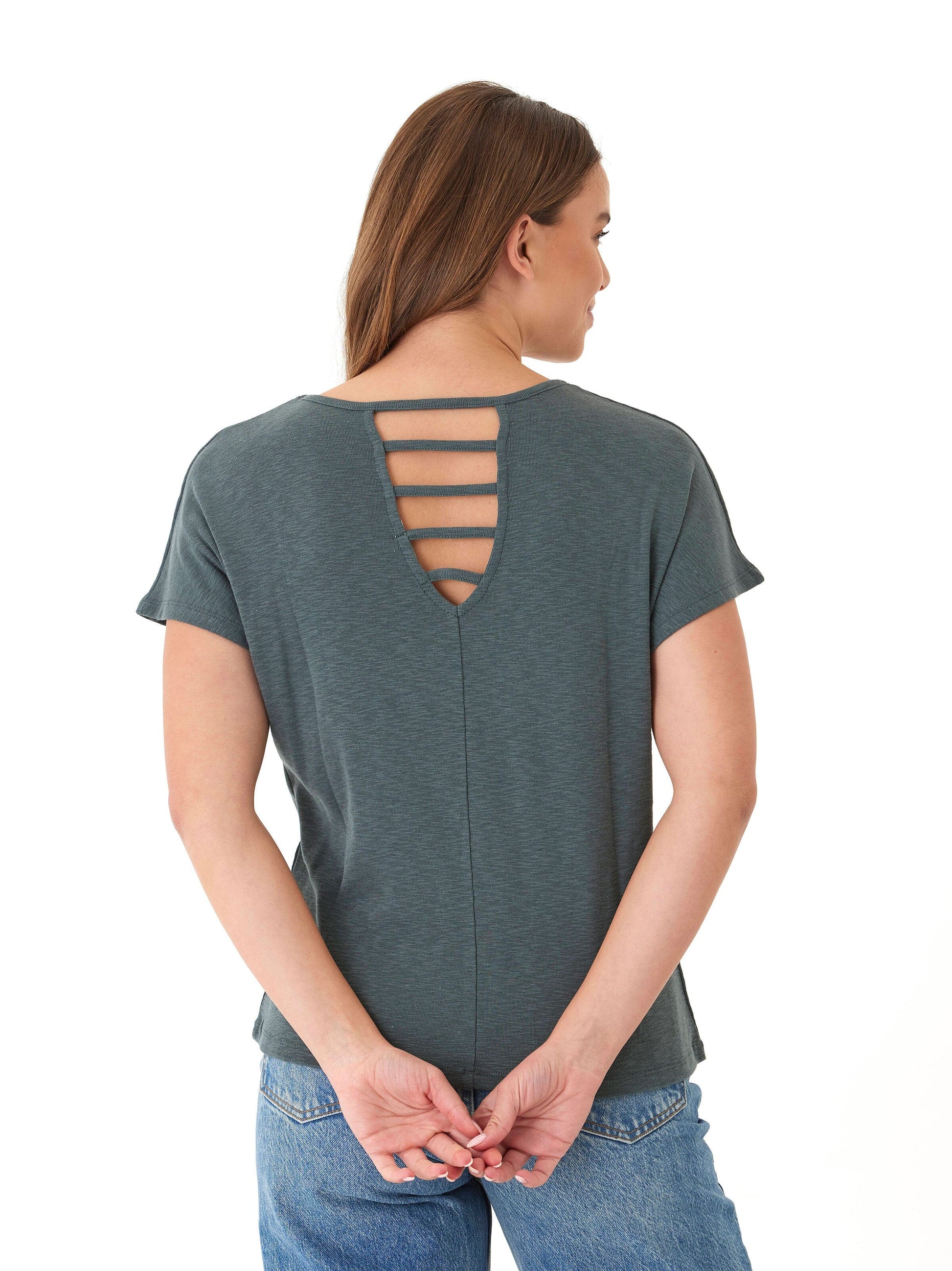 An everyday essential with a twist. Crafted from soft, stretchy slub fabric, this tee features a relaxed fit and subtle ladder detailing at the back for a hint of unexpected style. Perfectly lightweight and breathable for effortless, laid-back looks.