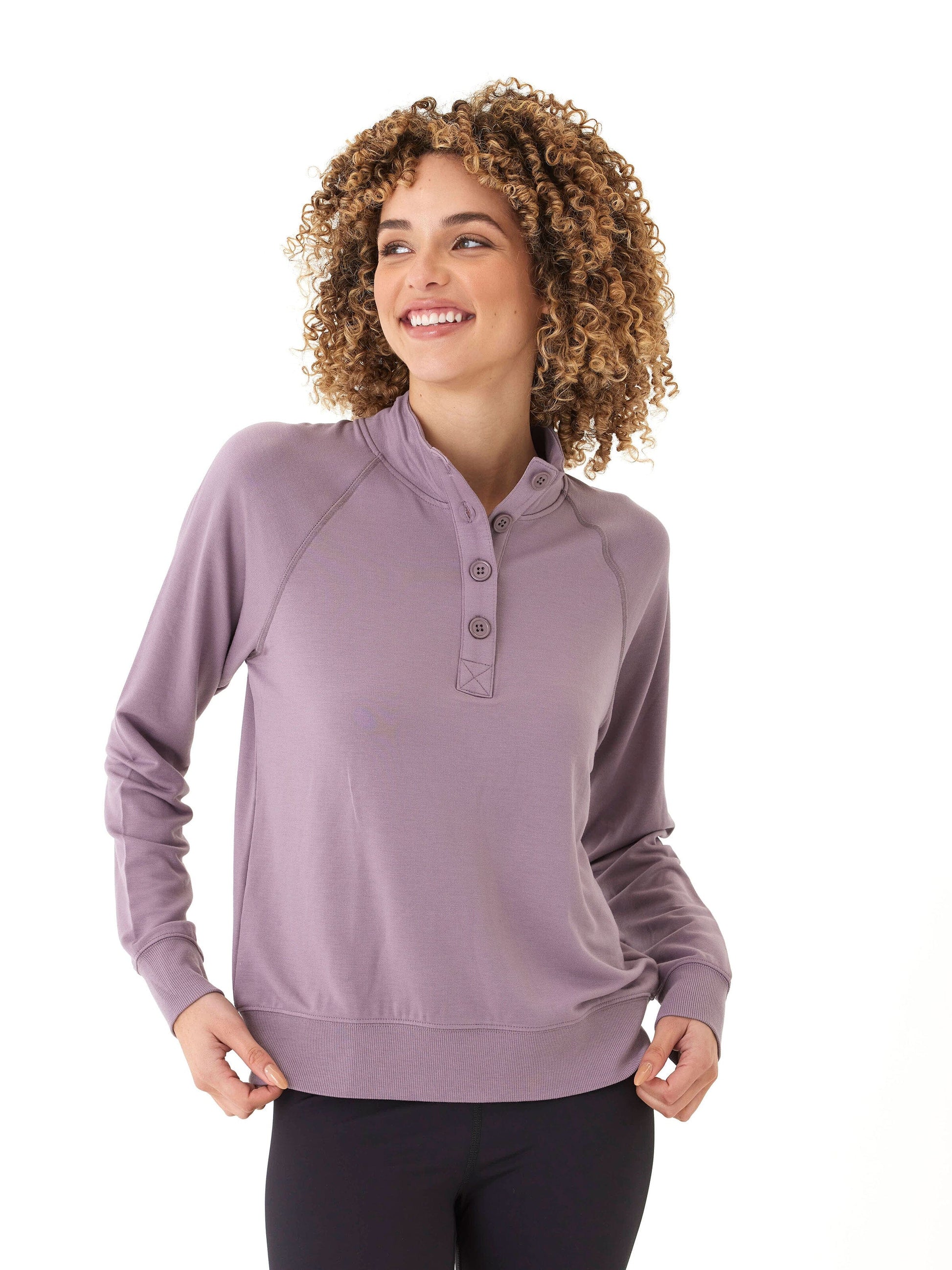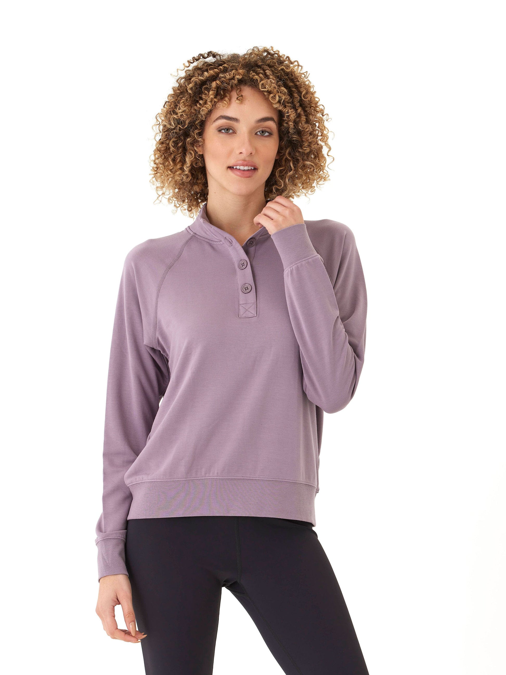 Stay cozy and stylish with this lightweight pullover, designed with a relaxed fit and a chic button-up mock neck. Crafted from soft, breathable fabric, it’s perfect for layering on active days or casual outings.