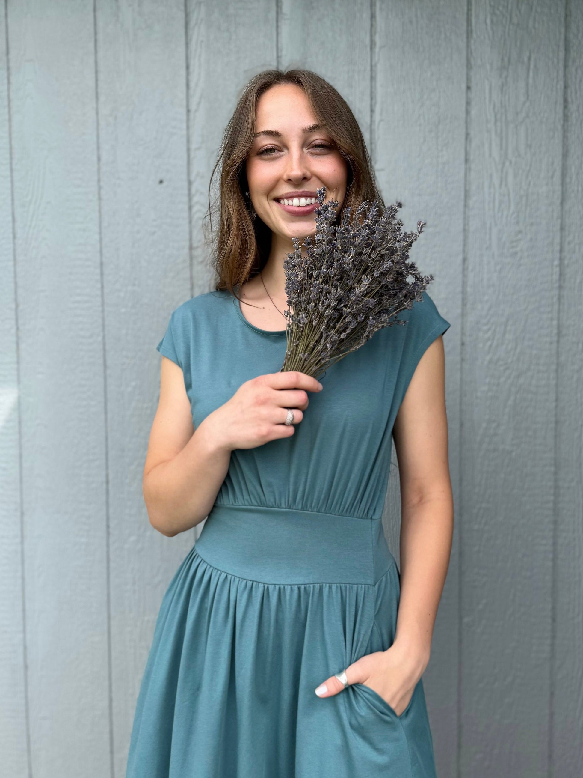 The Catherine dress is designed with the breeziness of a sleeveless cut, yet with a flattering armhole design that comfortably covers the armpits. Its elegant neckline, beautiful gathering at waist and fit-and-flare silhouette, falling just below the knees, create a graceful and timeless look. Pockets are hidden in the side seams.