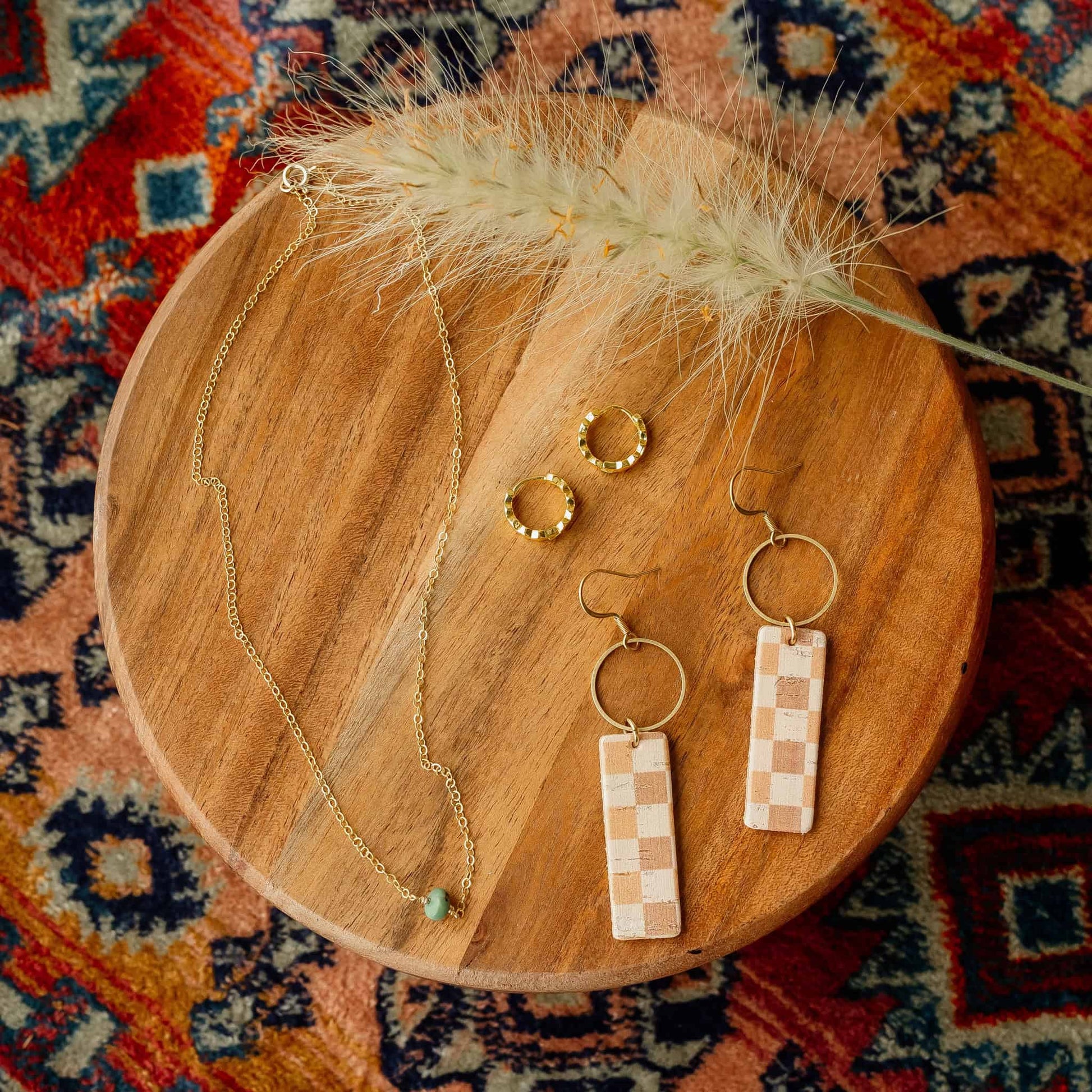 One of our best selling leather statement earrings. The neutral coloring of the Checkered Mia Earrings with a modern print make them a versatile addition to any outfit. Handmade with cork and raw brass accents, these lightweight earrings are a classic piece of affordable ethical jewelry.