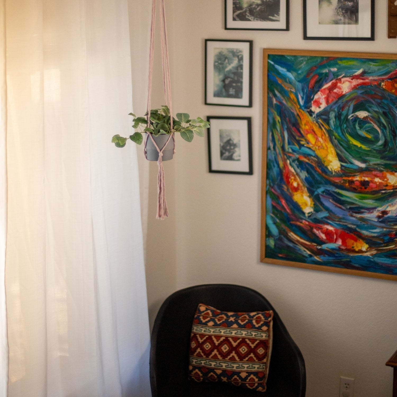 Our colorful, boho-inspired fair trade plant hanger is a perfect handmade home décor piece to brighten up any living room, nursery, or office. Hand crafted from cotton rope, this beautiful plant hanger will add style to your home, while helping provide dignified employment and holistic care for deserving women. It can accommodate small - medium planters of varying shapes.
