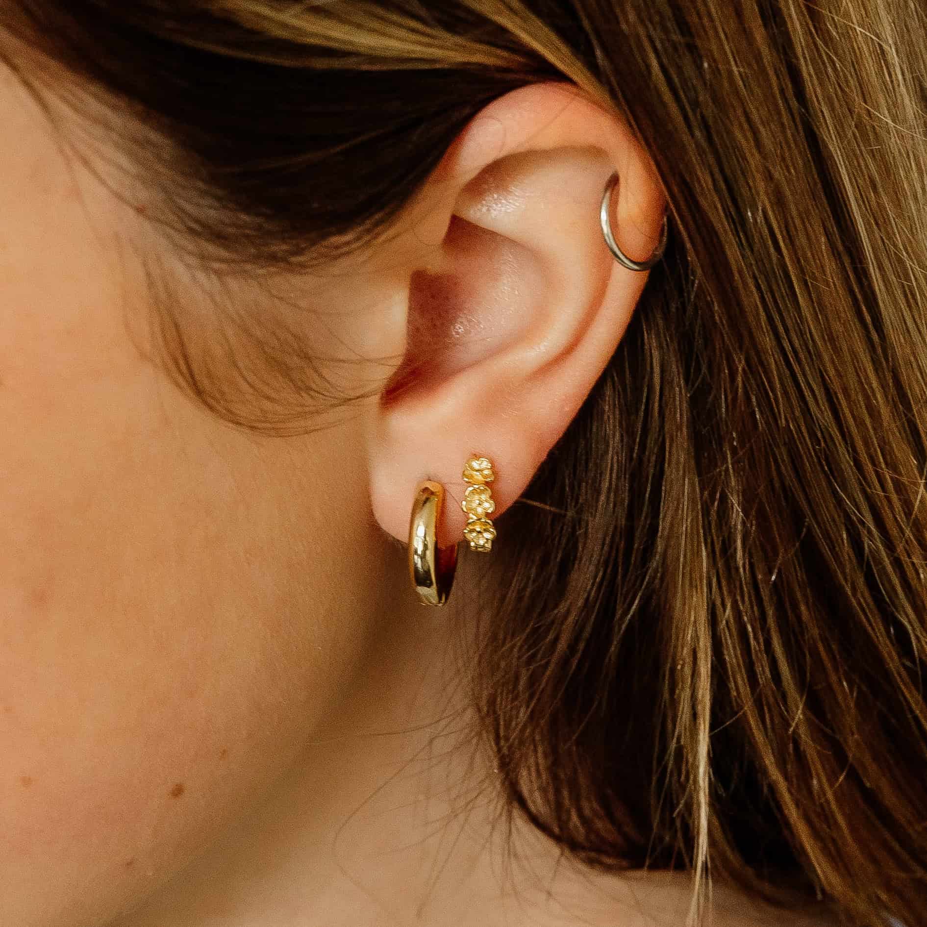*Note model is wearing the Everyday Hoop Earrings in her first piercing and the Flower Huggie Hoops in her second piercing.