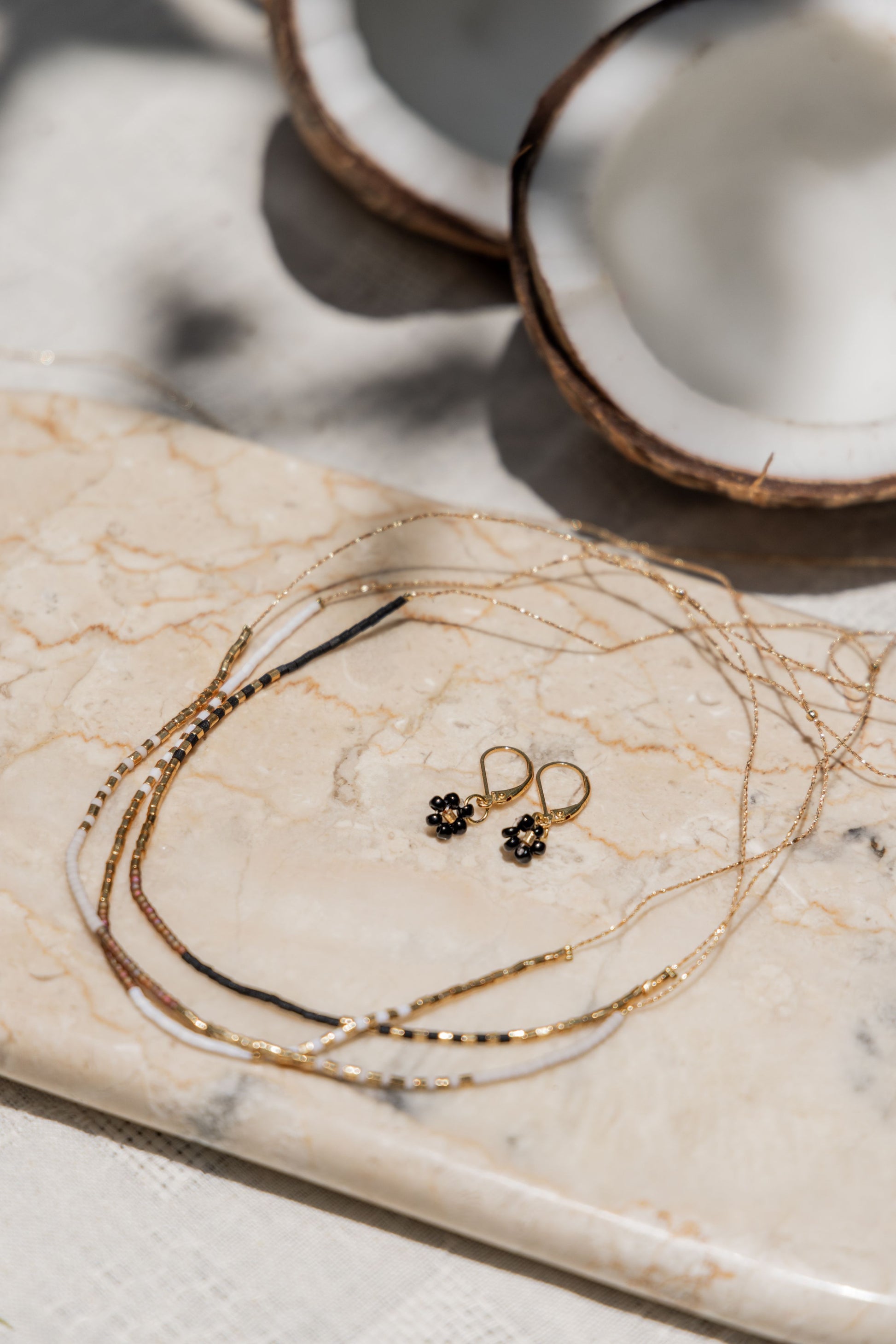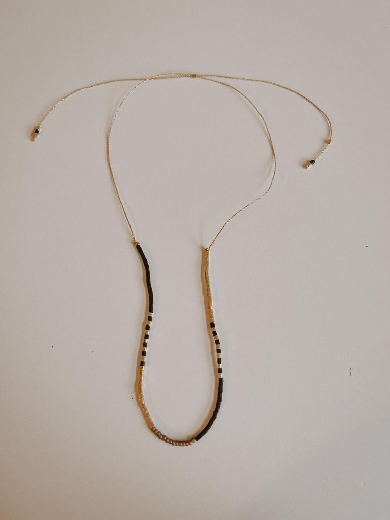 This elevated necklace not only adds a small dash of color, but also beautiful gold plated beads for an elevated look. This adjustable piece is perfect for any length, displaying the beautiful gold strands down your back with each length. Choose from 5 different colorways.