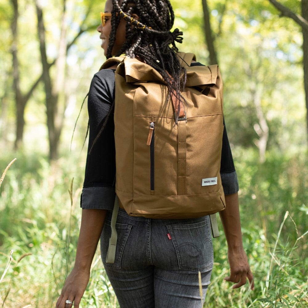 The latest Roll Pack is your perfect companion for both adventures and daily use. Crafted from durable, weather-resistant 100% recycled plastic bottle material and eco-friendly, vegetable-tanned leather, it combines longevity with sustainable style.