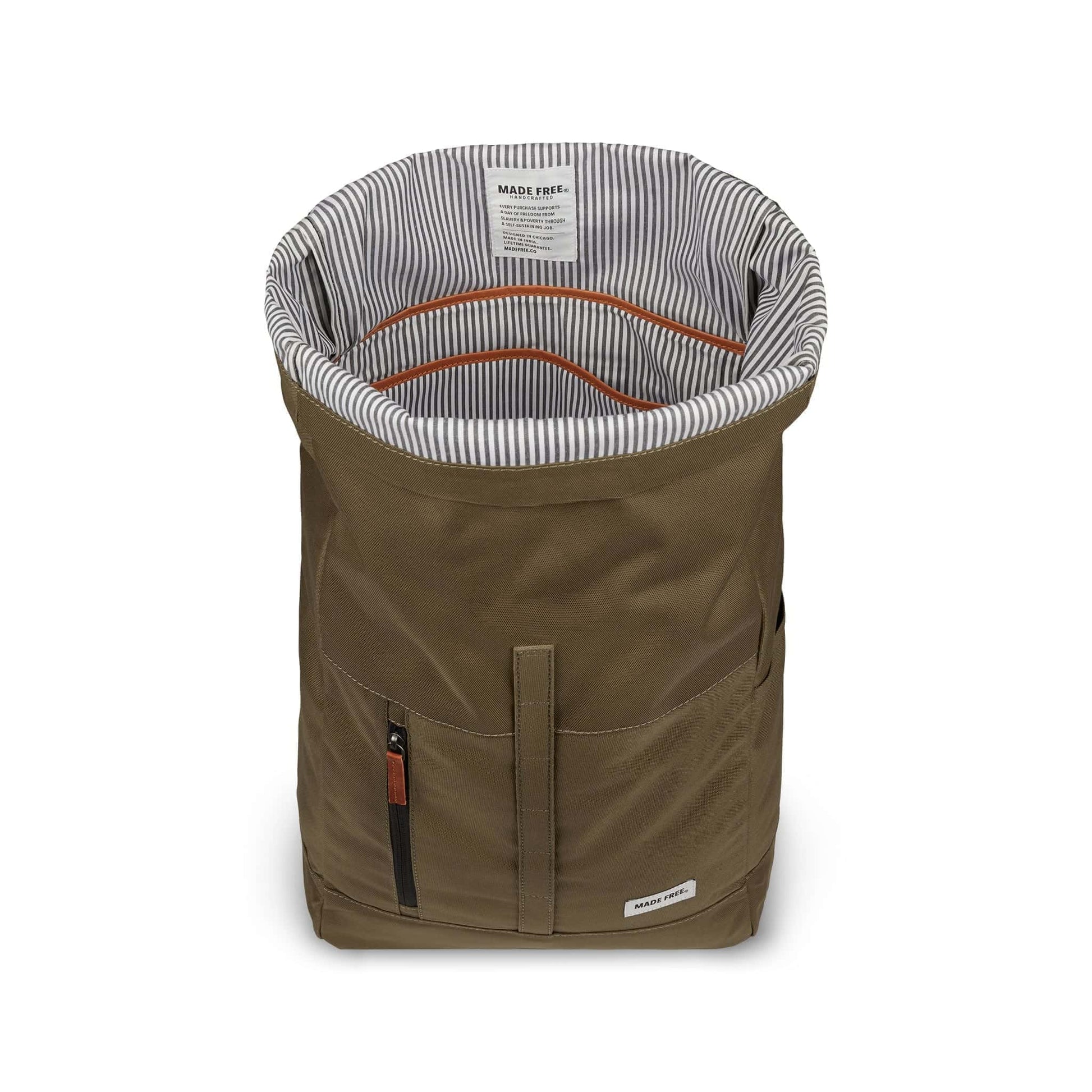 The backpack features a roll-top closure that lets you adjust its volume to meet your needs. Additionally, padded pockets and stylish leather trim enhance its security and comfort, ensuring a reliable and flexible carry throughout the day.