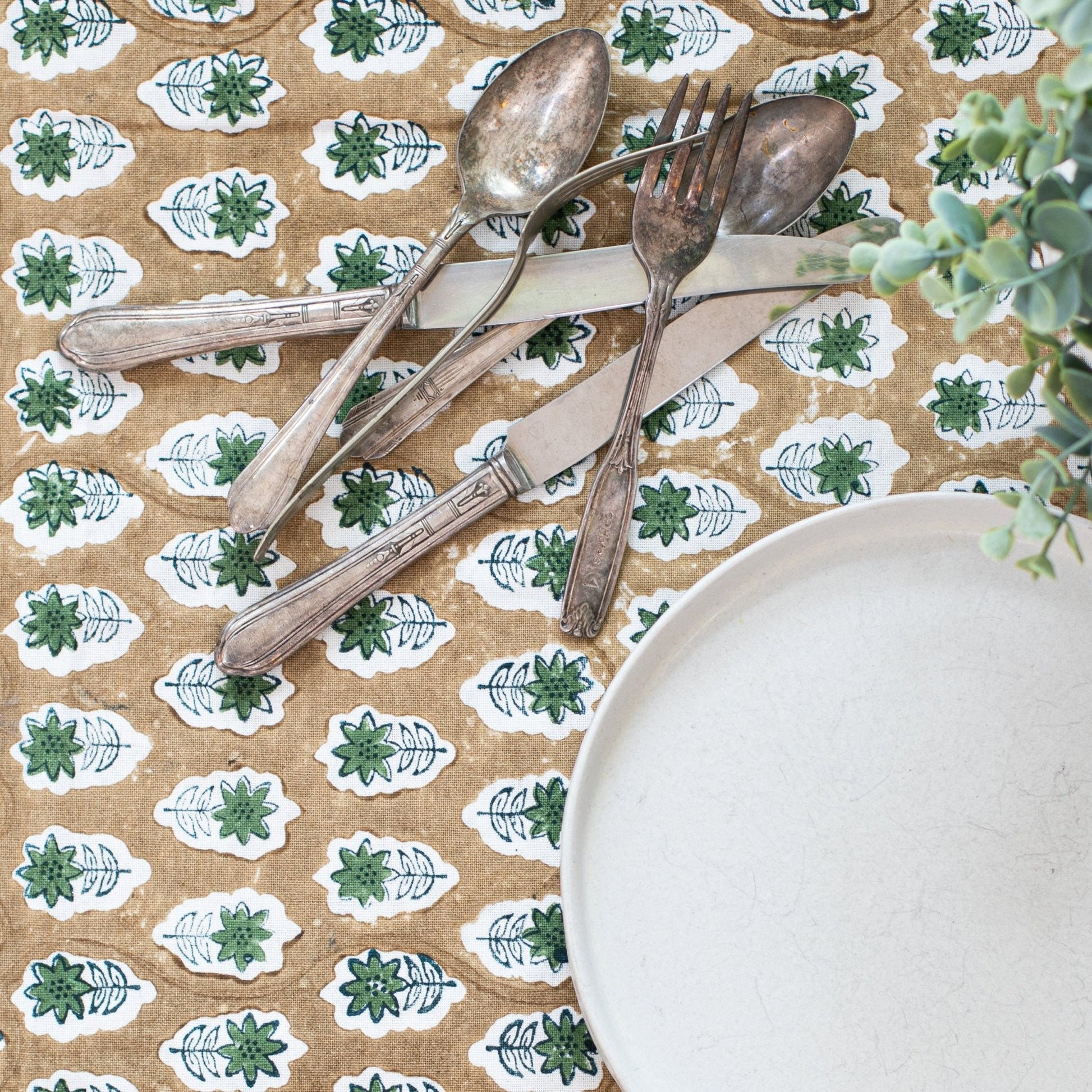 Hand block printed by survivors of modern day slavery Poinsettia - Midnight, Chai, & Sage